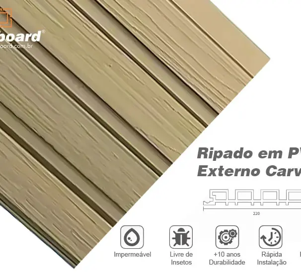 Fabricado em PVC virgem e tratato para resistência UV da radiação solar, o Ripado Externo Wallboard é um material inovador que combina a beleza da madeira com a durabilidade do plástico, resistente às intempéries, evitando empenos e desgastes comuns em madeiras tradicionais.